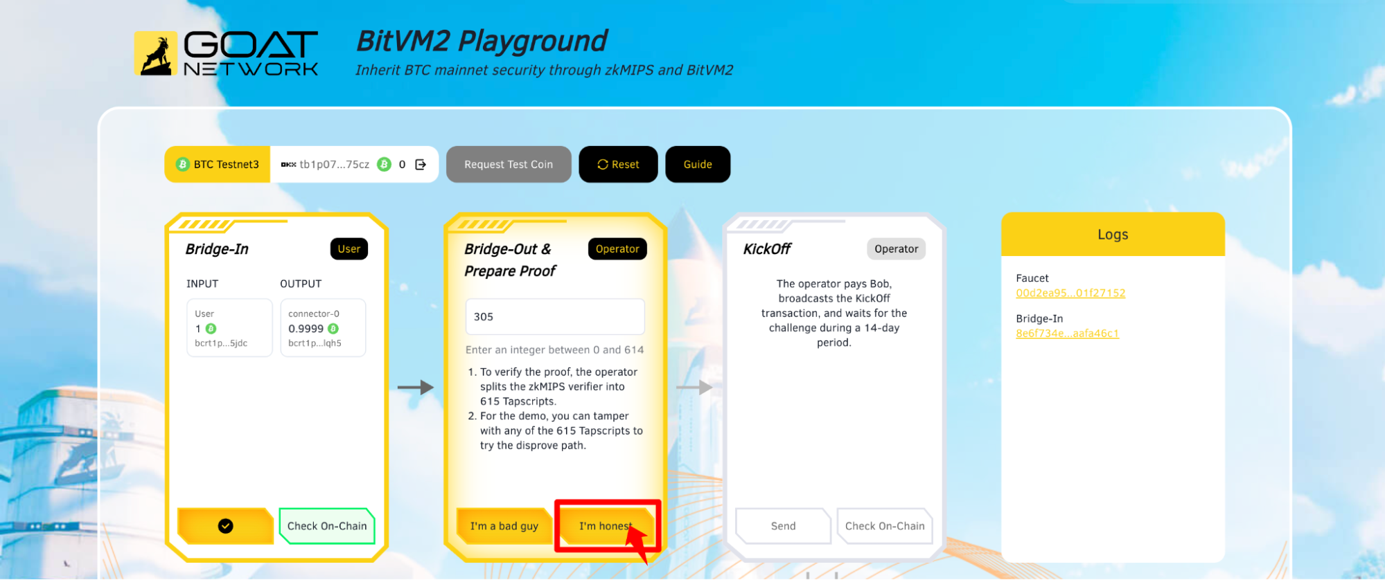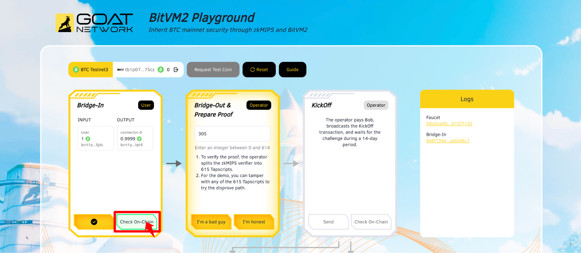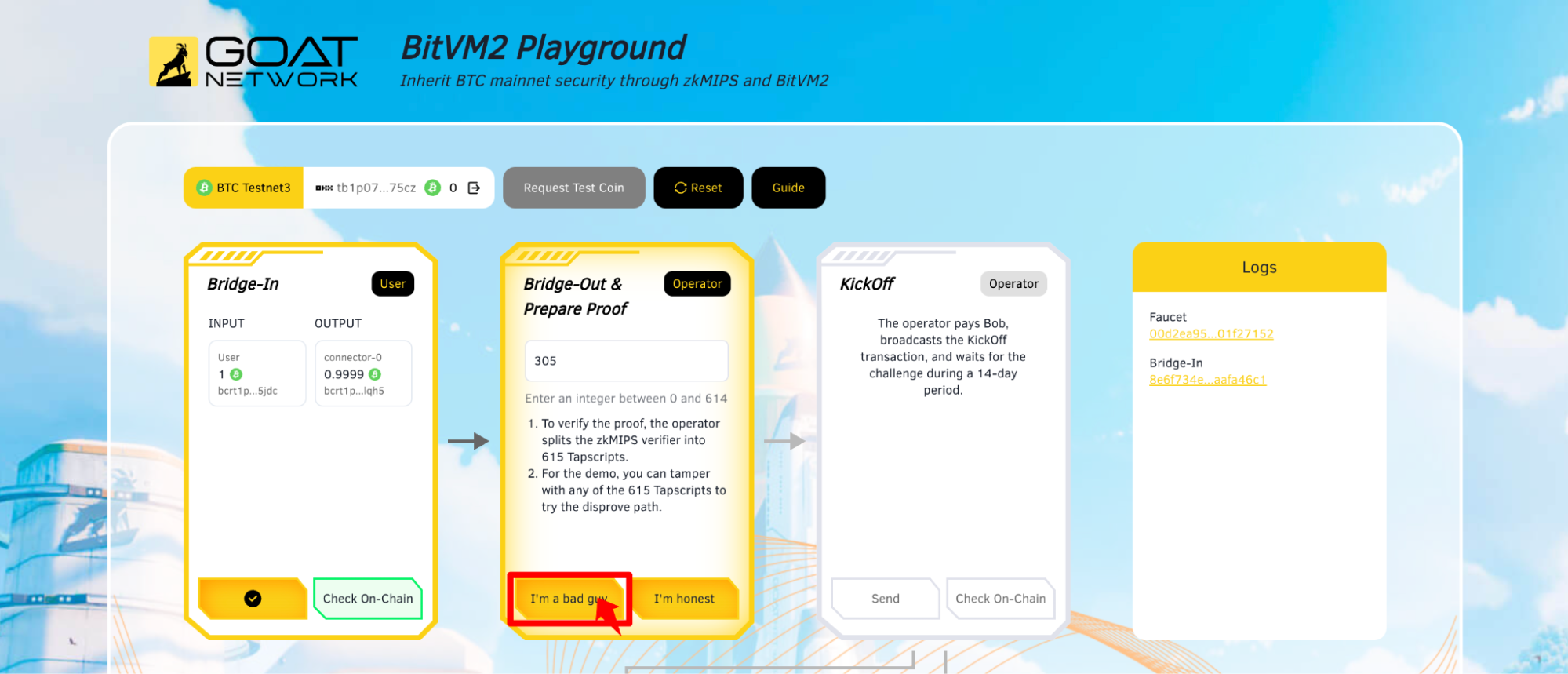 Welcome to the BitVM2 Playground! Here, you can see what it feels like to run the BitVM2 protocol with zkMIPS to verify the GOAT Network's valid zero-knowledge proof; whether you’re a high-level dev or a regular Joe!