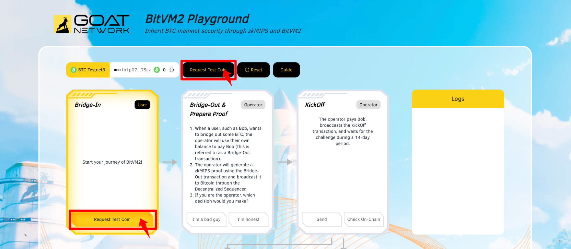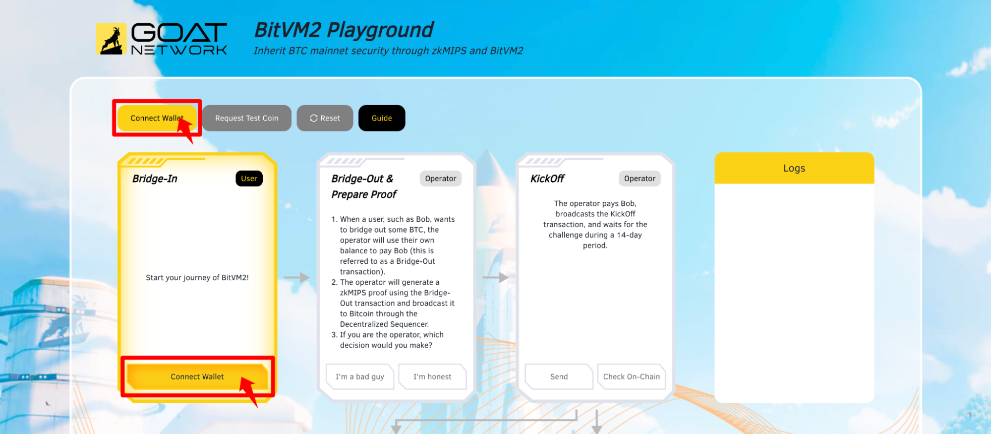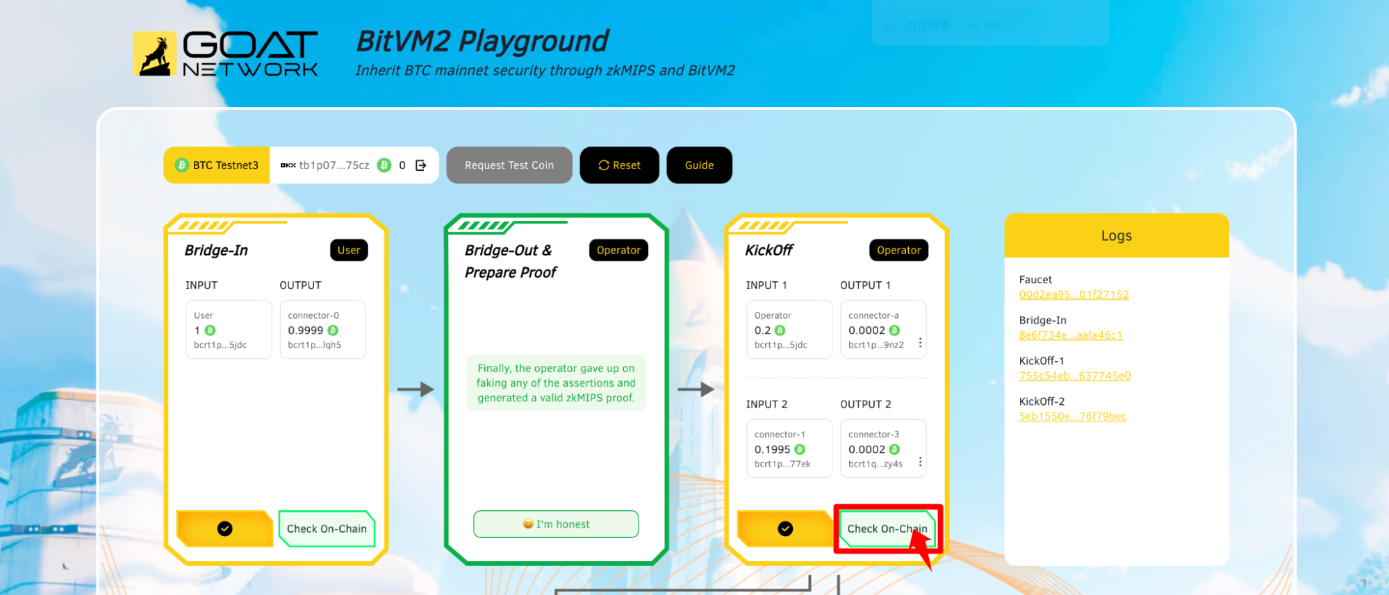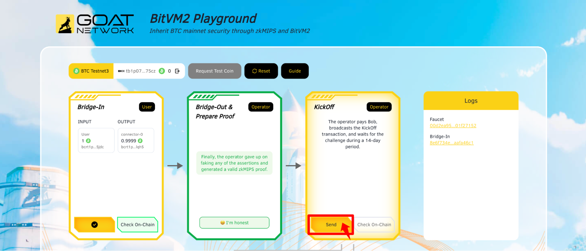 Welcome to the BitVM2 Playground! Here, you can see what it feels like to run the BitVM2 protocol with zkMIPS to verify the GOAT Network's valid zero-knowledge proof; whether you’re a high-level dev or a regular Joe!