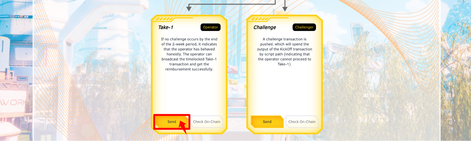 - Because you chose to trust the operator, the operator will broadcast the timelocked Take-1 transaction and get reimbursed successfully. Your user journey has now come to an end.
