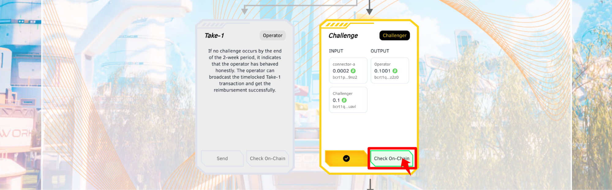 A challenge transaction is pushed and this will spend the output of the KickOff transaction by script path (which indicates the operator can not go to Take-1).