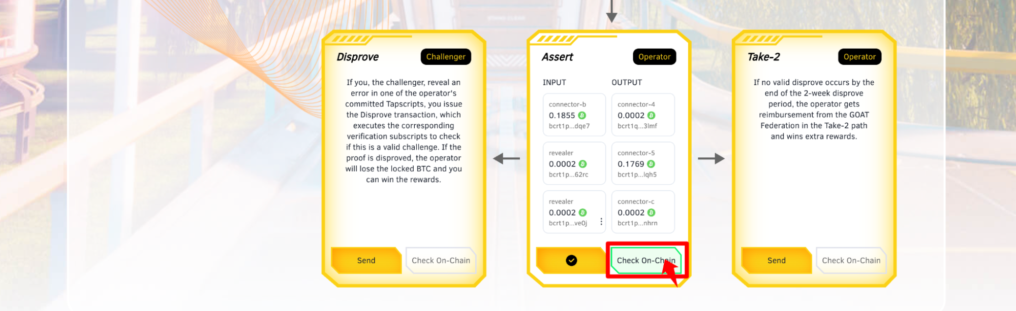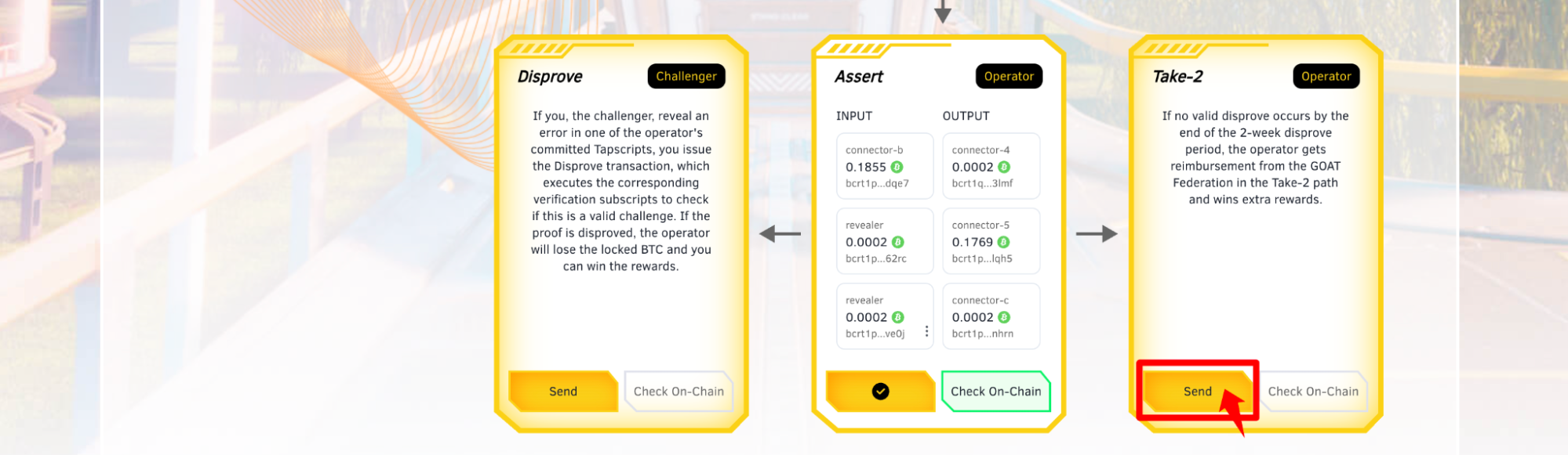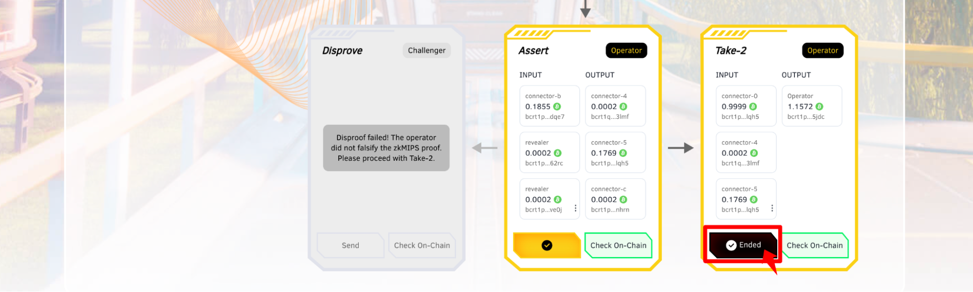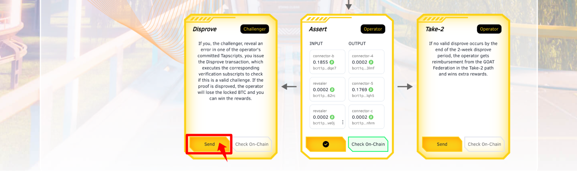 If you, the challenger, revealed an error in one of the operator's committed Tapscripts, you issue the Disprove transaction, and it will execute the corresponding verification subscripts to check if this is a valid challenge. If the proof is disproved, the operator will lose the locked BTC and you can win the rewards. In simpler terms: